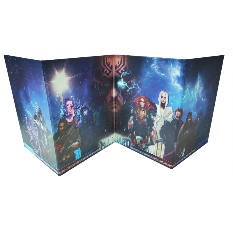 Solidnie wykonany, czteropanelowy ekran Mistrza Gry do MidGuard: Gra fabularna, z przepiękną grafiką cieszącą oko graczy po jednej stronie, oraz niezbędnymi do prowadzenia informacjami po drugiej.
