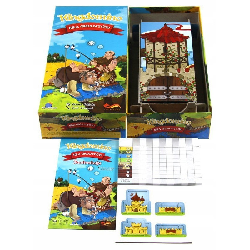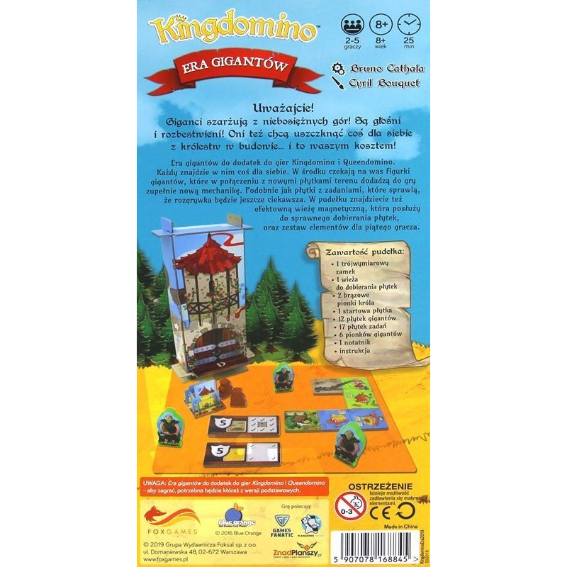 Kingdomino: Era Gigantów to rozszerzenie zarówno do gier Kingdomino, jak i Queendomino. Wprowadza dodatkowe elementy takie urozmaicające rozgrywkę – nowe płytki domina, kafelki celów, drewniane figurki Gigantów, magnetyczną wieżę na płytki oraz dodatkowe komponenty dla 5-tego gracza. Dzięki temu dodatkowi możesz czerpać jeszcze więcej radości z Kingdomino oraz Queendomino! Nowe rozwiązania zwiększają możliwości taktyczne, czyniąc rozgrywkę jeszcze bardziej fascynującą!