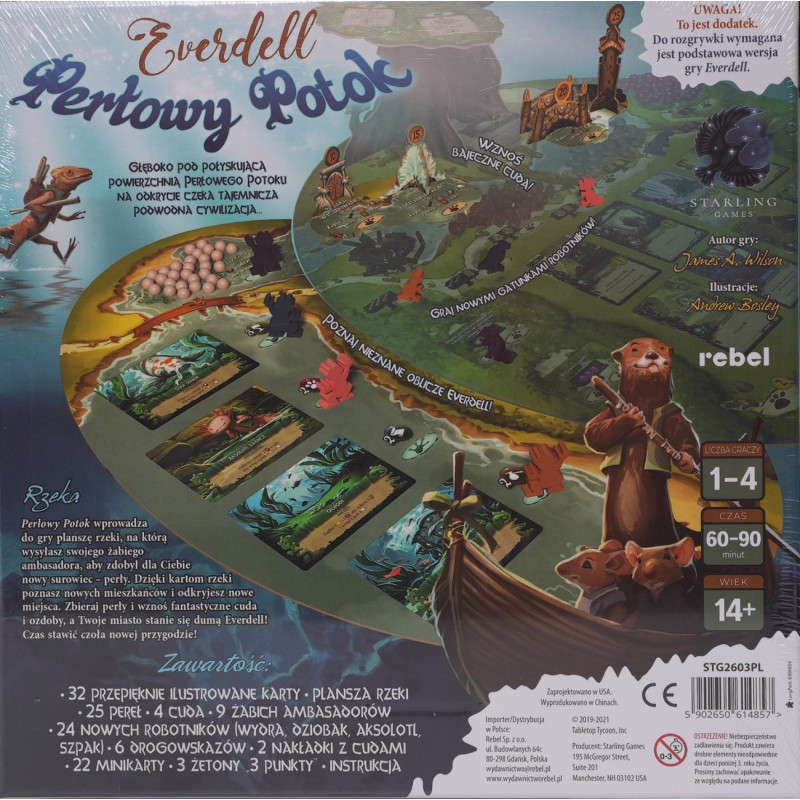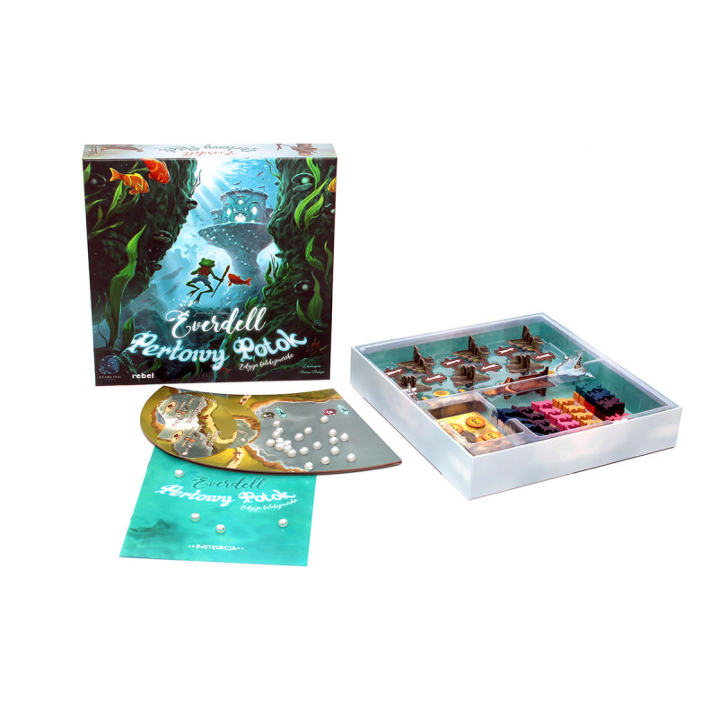 "Perłowy Potok" (edycja kolekcjonerska) to bogate rozszerzenie do bestsellerowej gry planszowej "Everdell", które pozwala graczom odkryć tajemniczą podwodną cywilizację. Głęboko pod migotliwą powierzchnią Perłowego Potoku czekają niezwykli mieszkańcy, którzy oferują nowy, cenny surowiec – perły. Jako obywatele doliny, gracze będą wysyłać swoich żabich ambasadorów w podwodne rejony, aby nawiązać kontakty dyplomatyczne z nowo poznanymi sąsiadami i wymieniać informacje oraz zasoby. Zbierz wystarczająco dużo pereł, aby stworzyć fantastyczne cuda i ozdoby, dzięki którym Twoje miasto stanie się dumą Everdell!