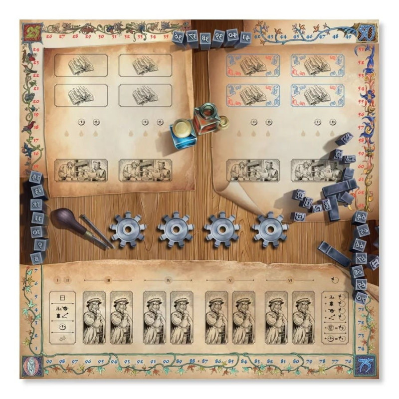 to gra planszowa dla 1 do 4 graczy, w której wcielicie się w pionierów drukarstwa w XV wieku. Poprzez realizację zamówień będziecie budowali swoje bogactwo i sławę, a usprawniając swoje zakłady drukarskie i pozyskując wsparcie mecenasów będziecie rozwijali swoje zdolności produkcyjne. Rywalizację zwycięży drukarz szczycący się największym uznaniem.