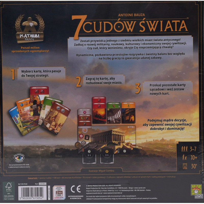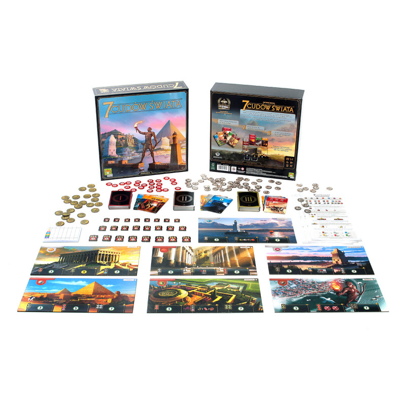 Zostań przywódcą jednego z siedmiu wielkich miast świata antycznego. Zbieraj surowce ze swoich ziem, weź udział w odwiecznym wyścigu cywilizacyjnym, nawiąż kontakty handlowe i stwórz militarną potęgę. Pozostaw ślad na kartach historii budując cud architektury, który przetrwa wieki! 7 cudów świata to świetnie zbalansowana gra o rozwoju cywilizacji, która łączy proste zasady i dynamiczną rozgrywkę z planowaniem i strategicznym myśleniem. Uczestnicy wcielają się w przywódców starożytnych miast, które starają się poprowadzić do jak najbardziej optymalnego rozwoju.