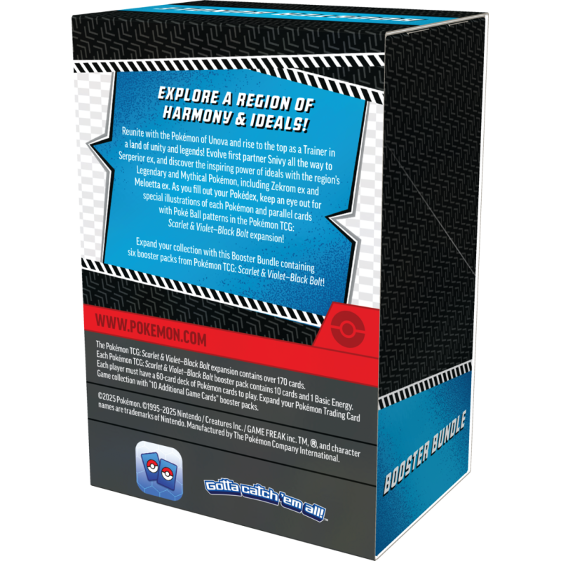 Odkryj inspirującą moc ideałów regionu Unova z legendarnym Zekrom! Ten Black Bolt Booster Bundle to pierwszy w historii split expansion TCG, oferujący unikalne doświadczenie kolekcjonerskie z kultowym regionem Black & White.
